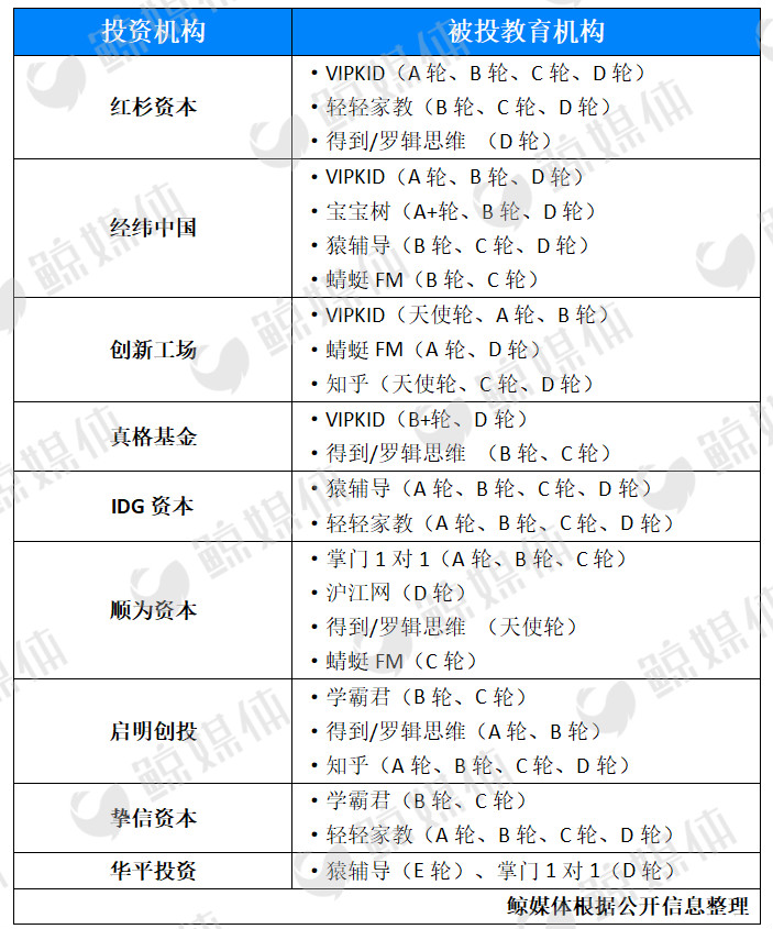 关注“鲸Media”微信公众号,回复关键词“投资机构”可查看7家投教育最多的机构投资一览表
