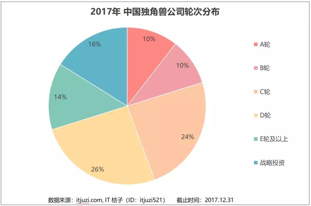 3)最新融资轮次:从独角兽公司的融资轮次来看,占比最高的是 D 轮(32 家公司、占比 26%),其次是 C 轮(30 家公司,占比 24%),相比 2016 年度占比最高的 B 轮,最重要的原因是不少 B 轮的公司均在 2017 年继续获得资本加注,有些公司甚至一年完成好几轮融资,在资本助推下高歌猛进到成熟期阶段(D 轮及以后)。