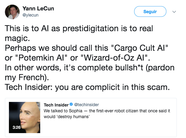 人工智能领域的大神 Yann LeCun 前不久也忍不住在 Twitter 上炮轰索菲亚“对于 AI 来说,就如同变戏法之于真正的魔法。”