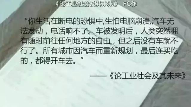 美国社会最臭名昭著的高智商“大学炸弹客”泰德·卡辛斯基,在1978到1995当中,他为了对抗现代科技而举行了全国性的放炸弹行动,以邮包或放置炸弹的形式造成三死23伤。图为其发表的论文