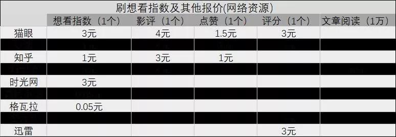 想看指数其实就是点击想看的人数,没有做过任何数据变换,这点要比哪些不公布算法的热度指数更容易理解和证实。一个账号只能提供一个想看数,这点要比物料播放量的水分少了很多,而且购票平台可以根据每个用户的历史购票记录来筛出一些刷量军和黑水军。再扔出一张扎心图,刷想看是不是比刷其他平台要贵很多~爱刷刷去吧!