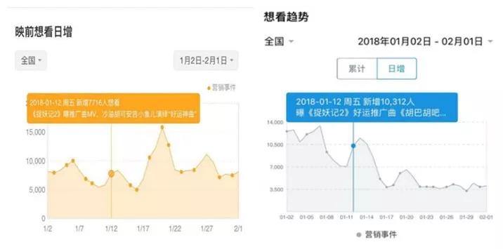 可以看到上图,《捉妖记2》同样的物料发布节奏,但两个平台的日增想看曲线走势明显不同,恐怕读者要又有所怀疑了,这是哪些因素导致的?