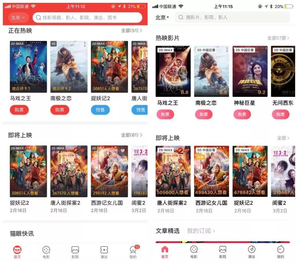 猫眼首页与淘票票首页