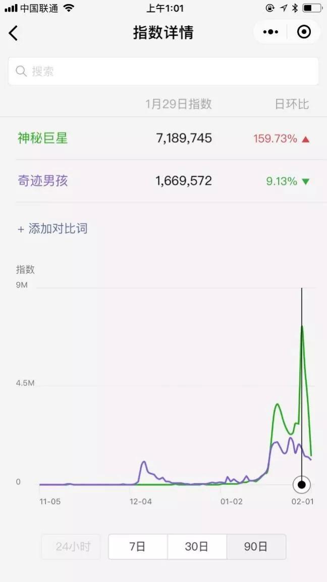 最老资格的指数,在曾经PC时代几乎是唯一的热度指标。下图是《奇迹男孩》和《神秘巨星》的指数对比图,乍一看特别特别符合目前票房差距,对吧?当然至于怎么看,后面会再介绍。