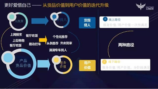 更好的爱惜自己,会带来从货品价值到用户价值的迭代升级。第一特点就是从以前的人找货变成现在的货找人。从过去人们在路上拦车变成使用滴滴打车,让车来找我。从以前我们去找信息,到信息来找我,比如今日头条个性化信息推荐。当然今日头条推得比较狠,前一段时间今日头条也在治理,它是精准推荐的太精准,哪天我看的段子稍微多一点,后几天就只能看段子了,有时还需要用自己人肉的方式去矫正它的算法。再有就是外卖到家,现在我们对于从过去到餐厅吃饭变成外卖送到家里已经司空见惯,很多这样的消费品牌出来,这个从人找货到货找人的变化过程,其实就是从商品价值到服务价值到用户价值转化的过程,这个过程在2017年有线上的创新,也有线下的创新。