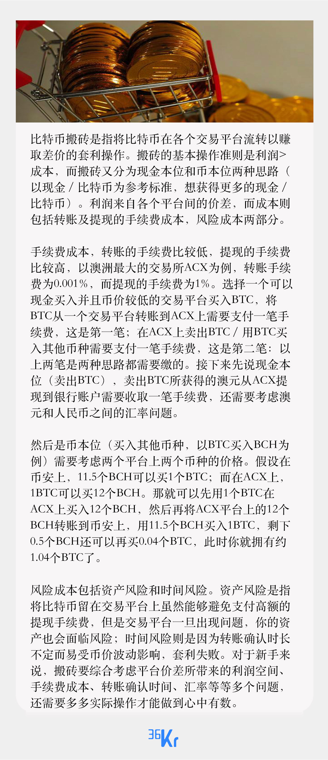 比特币搬砖是指将比特币在各个交易平台流转以赚取差价的套利操作。