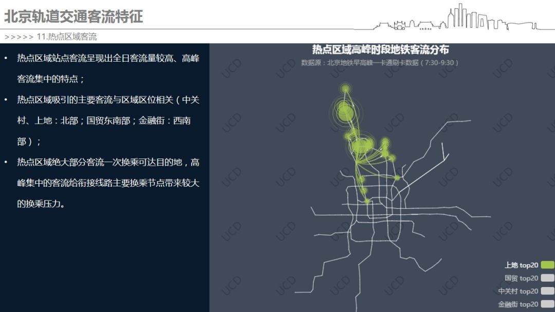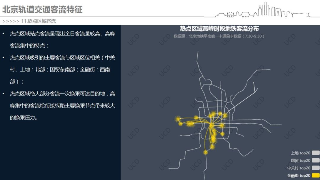 可以看到,在高峰时刻,热点区域吸引的客流主要还是和区位有关。比如中关村和上地等站,主要吸引了来自北京北部的客流,而金融街,则吸引了北京西南部的客流。
