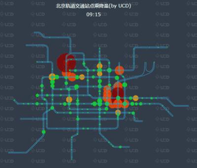 下图是北京地铁站点从5点到10点45分之间,每隔15分钟的乘降量(为进站客流、出站客流、换乘客流的总和)分布图,从中能够看出,北京地铁客流量较大的区域主要集中在城区的西北部及东部。