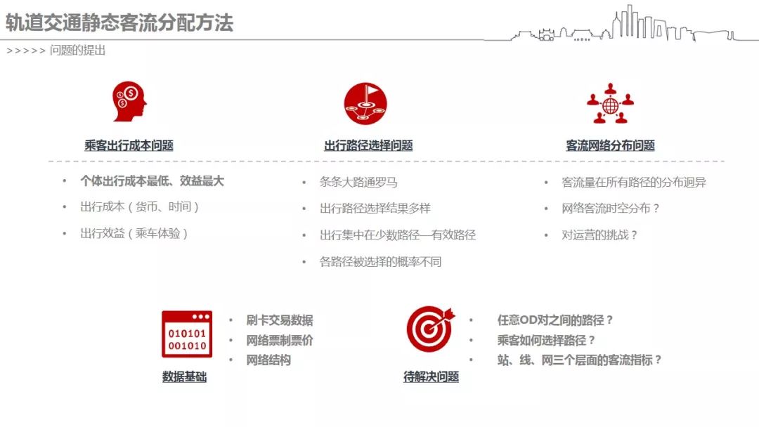 针对这些问题,我们现在已经有了地铁刷卡数据,也知道一个城市的票制和票价,还知道城市的轨道交通网络的结构,那么我们需要解决的问题就是把这些客流通过刷卡数据把它们分配在网络上,同时还要做一些轨道交通的站点、线路以及网络这三个层面的一些客流指标的统计。