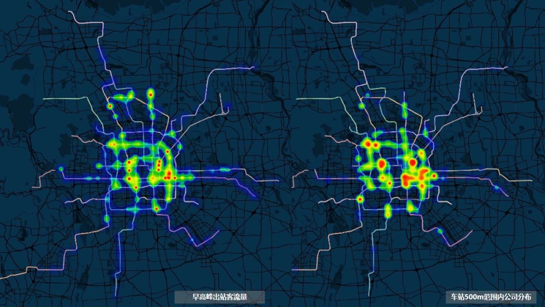从北京总体上来看,早高峰进站客流量最大的区域主要分布在北部(回龙观、天通苑等)、东南部(宋家庄周边)等大型居住社区。而出站客流最大的区域如国贸、中关村、东直门等,结合车站500米范围内的公司分布数量来看,客流量和就业地也是颇为匹配的。