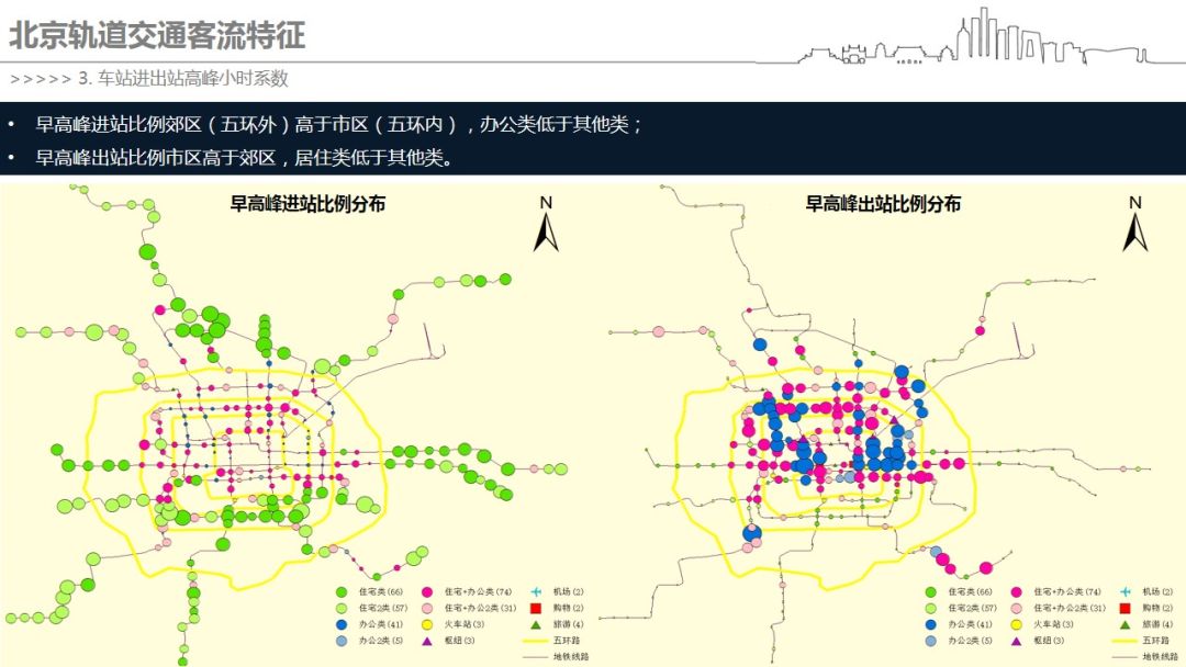 上图的右侧图表能够很明显看出地铁车站的类型。可以发现,北京五环、六环之外的车站基本上都是居住类的车站,而中心城区尤其是二环、三环以内的一些车站,基本上周边都是办公区。