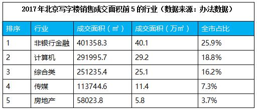 回顾这两年的北京写字楼市场成交,金融、科技行业是成交的主力,办法数据显示,2017年非银行金融、科技占据了写字楼市场55%的租赁交易面积。