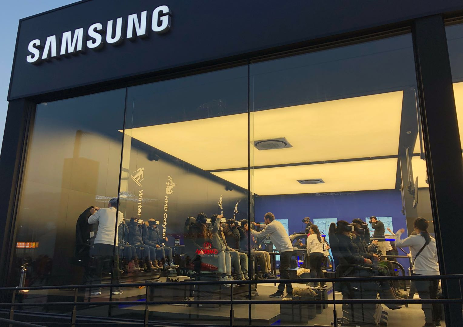 在开幕式场馆外,我们看到了几个赞助商的小型场馆。作为本土企业三星的展馆面积最大,不少观众排队等待进入体验。除了常规的手机外,三星还专门准备了VR体验区。