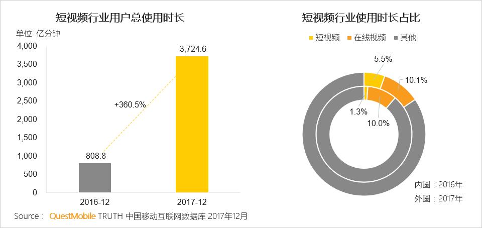2017年短视频使用时长占移动互联网总使用时长的5.5%,而这一比例在2016年刚刚达到1.3%。