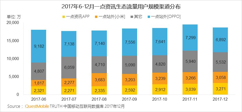 2017年12月相较于2017年6月整体增长率为3.5%,OPPO和小米为一点资讯带来亿级用户流量。