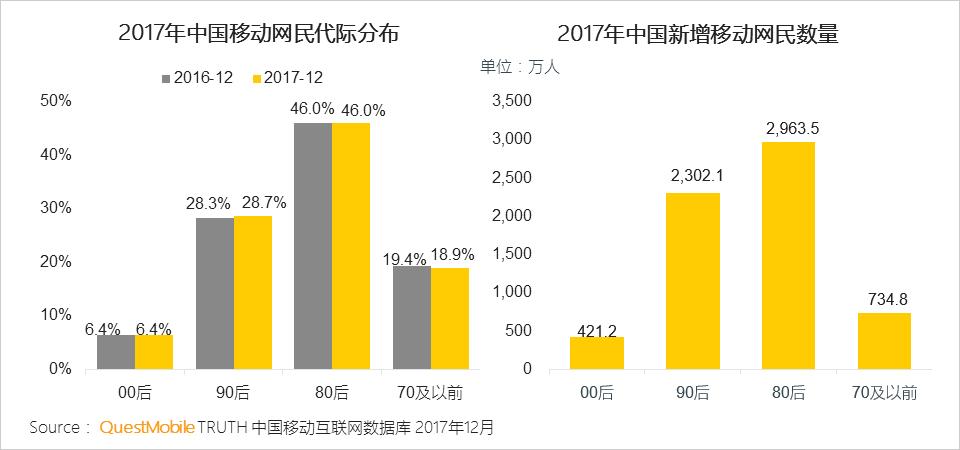 2017年整体网民代际分布保持稳定,90后占比增加0.4个百分点;从新增网民来看,80后增加2963.5万人,其次是90后,增加2302.1万人。90后、00后作为移动互联网的原住民,将逐步登上舞台。