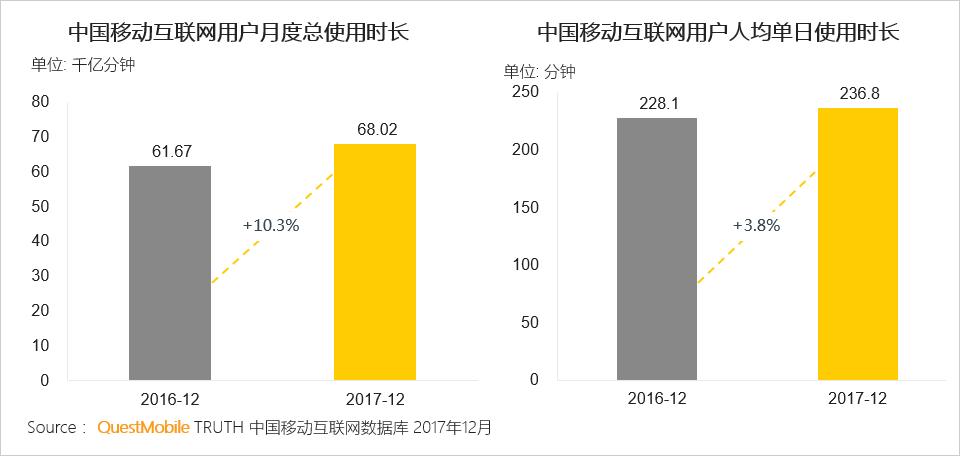 用户人均单日使用236.8分钟,即3.9小时,稳中微升