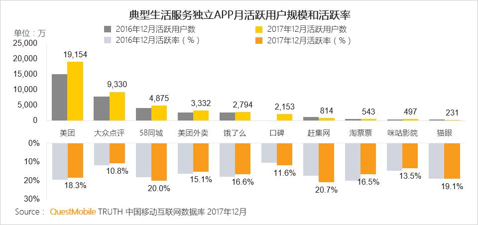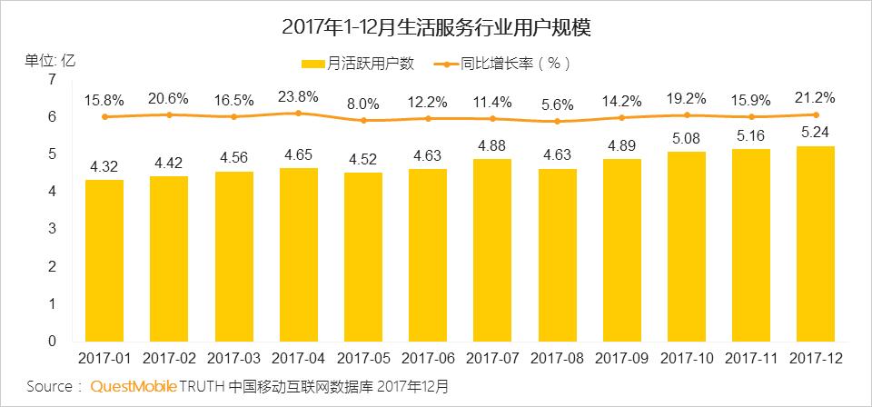 2017年生活服务行业月活跃用户规模稳健增长