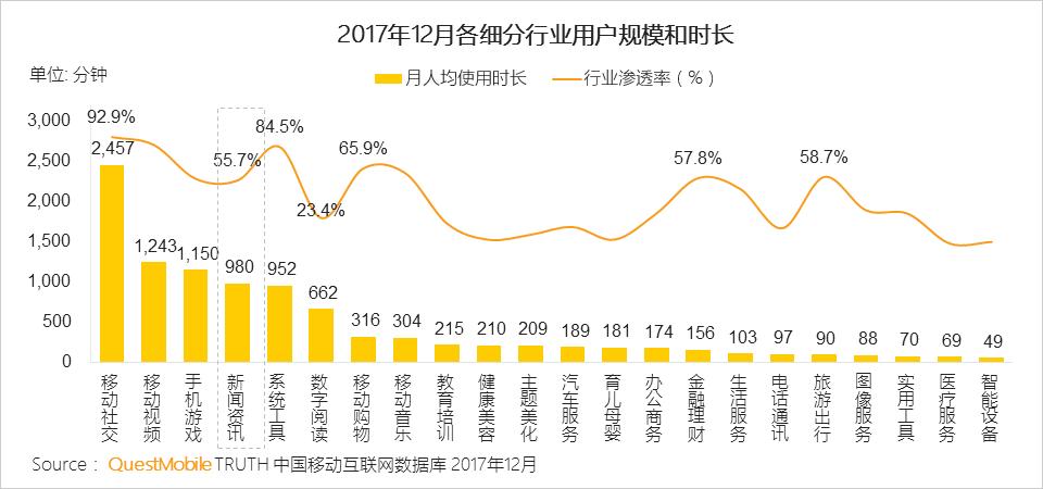 新闻资讯行业用户使用深度和粘性都较高,月人均使用时长位居全行业TOP4。