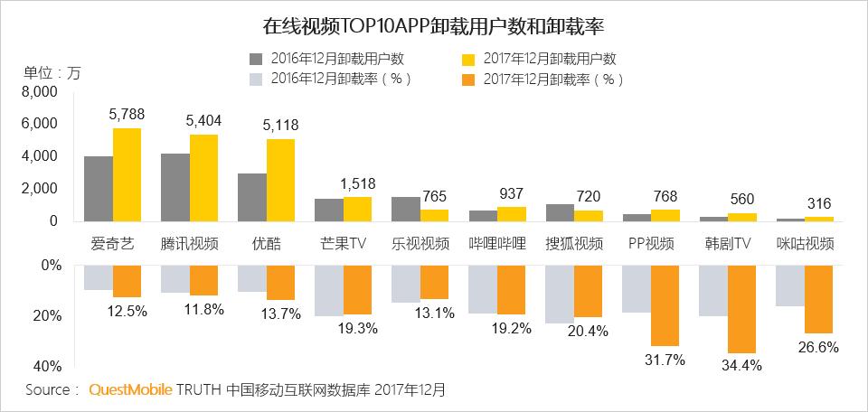 TOP2平台活跃用户卸载率也有所提升,TOP3在12月的卸载用户量都在5000万以上,流量大进大出,虽然30日留存有所提升,但卸载量同样高居不下,用户在APP间流转的现象强化,包月到期或内容播完之后转换平台的现象更明显。