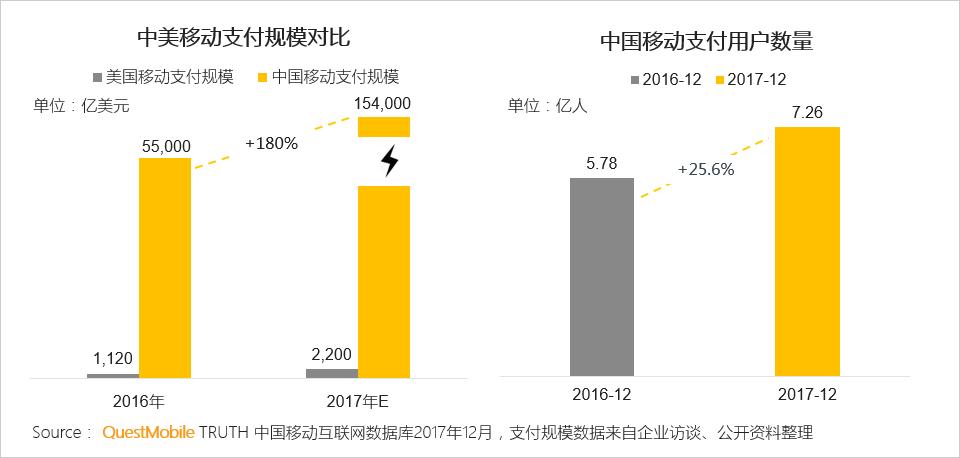 2016年中国移动支付规模已经达到5.5万亿美元,预计在2017年将会达到15.4万亿美元;根据QuestMobile数据,我国移动支付用户规模从2016年的5.78亿增加到7.26亿。