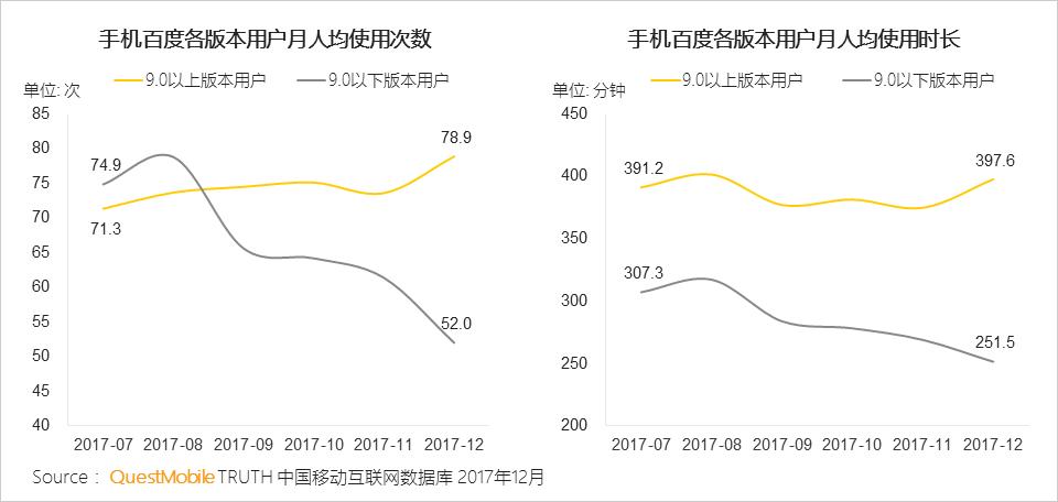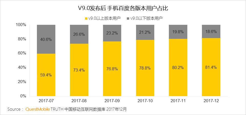 2017年7月,手机百度v9.0发布,版本升级用户占比逐步提升。