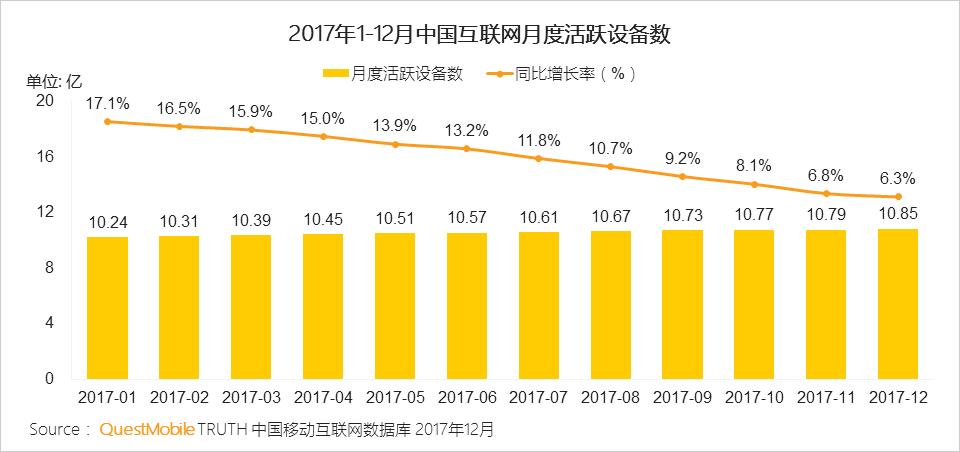 2017年中国移动互联网月度活跃设备总数稳定在10亿以上,从2017年1月的10.24亿到12月的10.85亿,增长非常缓慢;同比增长率也呈逐月递减的趋势,再次验证人口红利殆尽,移动互联网用户增长面临巨大考验的现状。