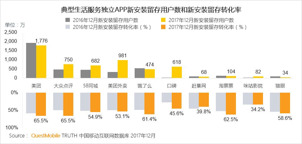 2017年新安装留存用户数和留存转化率均较好的APP:美团外卖、大众点评、58同城。