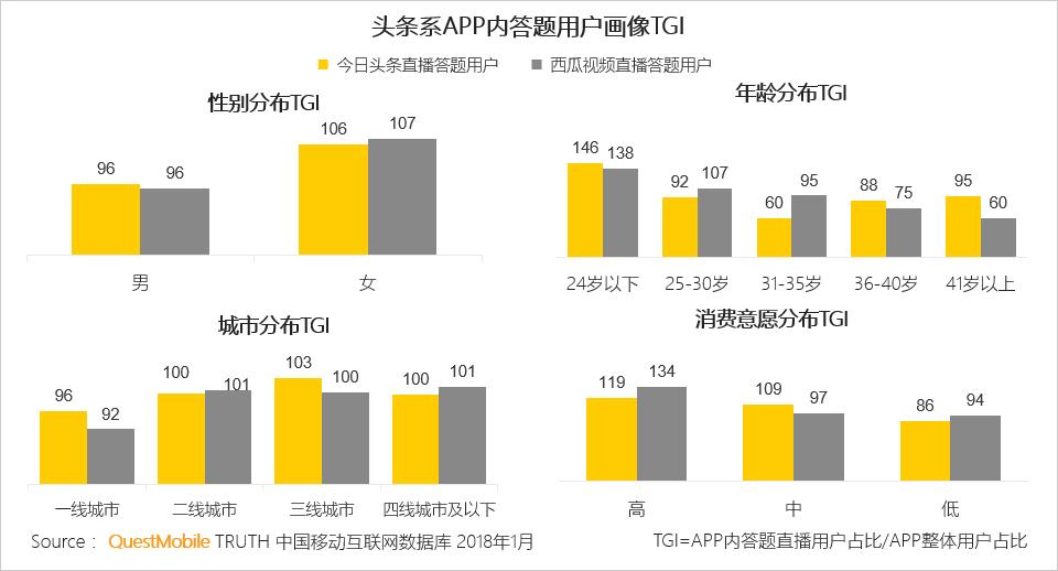 与今日头条和西瓜视频整体用户相比,参与直播答题的用户群中,24岁以下用户TGI指数更高,年轻人对该种新颖的方式更追捧,同时,线上消费意愿相对较高的人,也喜欢答题拿奖金。
