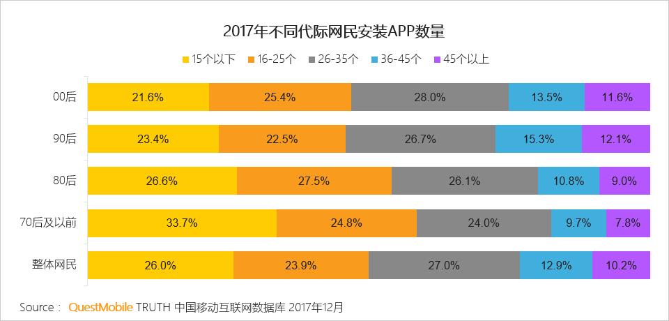 年纪越小越爱尝鲜,00后人均使用APP21.9个,70代只有13.4个