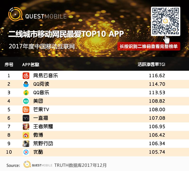 网易云音乐凭借社交、智能推荐、音乐内容的建设,当然还得益于2017年几次特别成功的营销活动,30日留存率业内最高,达到35.6%。