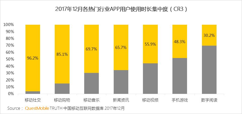 强者恒强,社交、购物、音乐、新闻和视频等热门行业,TOP3APP的用户使用时长集中度均在50%以上,移动社交领域尤为突出,微信、QQ和微博是中国最大的社交产品,他们的使用时长行业占比高达96.2%。