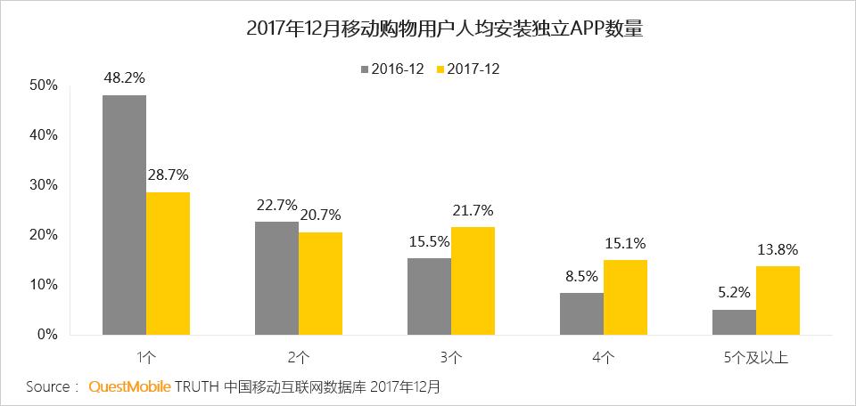 用户的注意力更加分散,安装3个以上购物APP的占比同比扩大