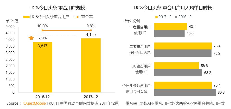 UC与今日头条用户重合率略有下降,独占用户人均单日时长增幅为7.5%。