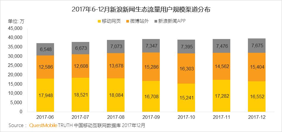 新浪新闻APP外流量为独立APP流量的4.16倍。移动网页对新浪新闻生态整体流量的贡献度超过40%,2017年12月相较于2017年6月整体增长率为6.9%,其中微博站外增幅最大为22.4%。
