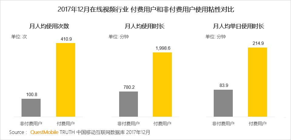 在线视频付费用户使用粘性显著高于非付费用户