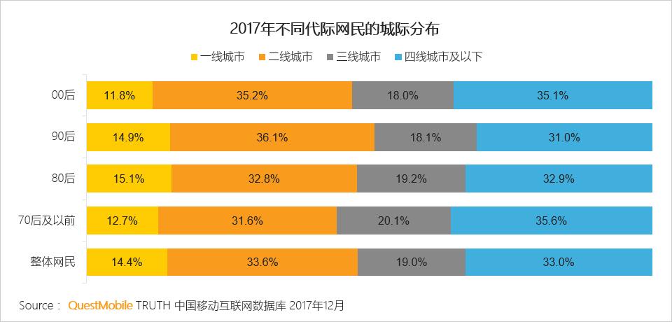 对比整体网民,80后一线城市占比最多,90后二线城市占比最多