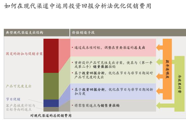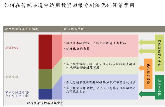 在传统渠道中,严格的投资回报分析不仅可以通过对标和标准化合同条款实现促销费用方案的简化,并且可以减少一次性的进货奖励支出。