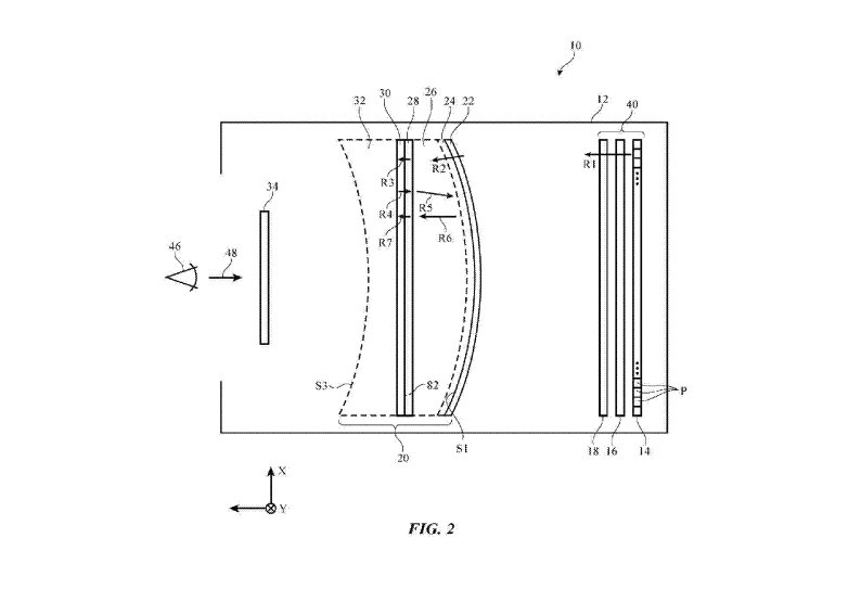 苹果公司建议未来的头显设备使用反射折射式光学系统 ( Catadioptric Optical System )来扩展图像。通过使用更加紧凑的镜片组对光线进行反射折叠,设备可以避免使用标准VR头显中又长又笨重的放大镜头。