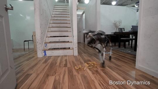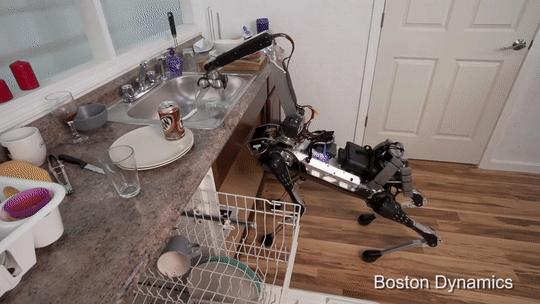 波士顿动力公司在2016年首次推出轻量级的SpotMini机器人,宣传视频中,它不仅可以洗盘子、捡垃圾、移动杯子,并且在不小心踩到香蕉皮跌到之后还能自行站起来。