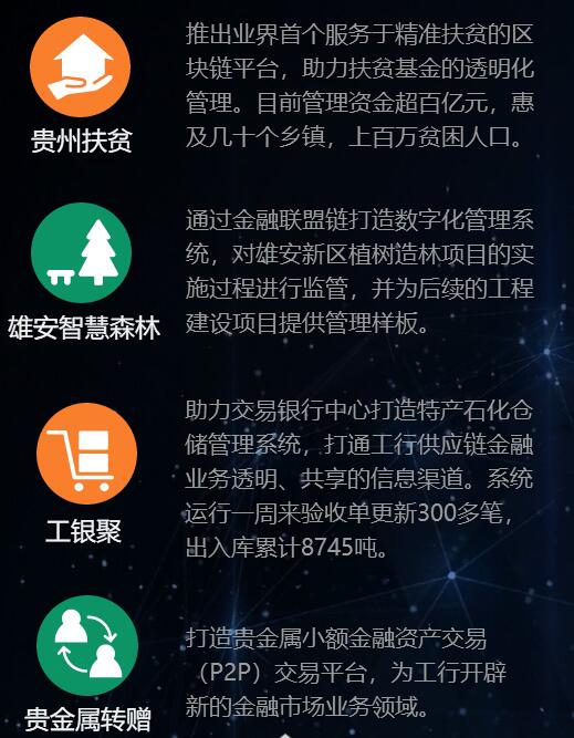 根据最新消息,工商银行成立了区块链与生物识别实验室。作为工商银行金融创新成果,工商银行软件开发中心区块链与生物识别创新实验室以“自主研发,兼容并蓄”为原则,研究出工行首个自主可控的区块链1.0平台。平台于2017年第四季度正式推出,已助力贵州扶贫、工银聚等项目投产。帮助工行在新技术应用领域迈出新的步伐。