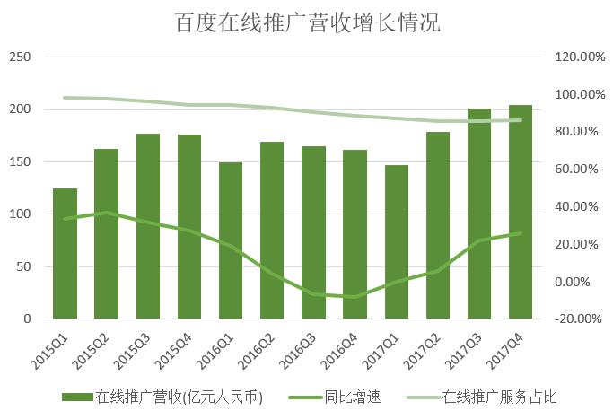 从分部营收来看,百度的在线推广营收204亿元,同比增长26%,占总营收比例为86%。