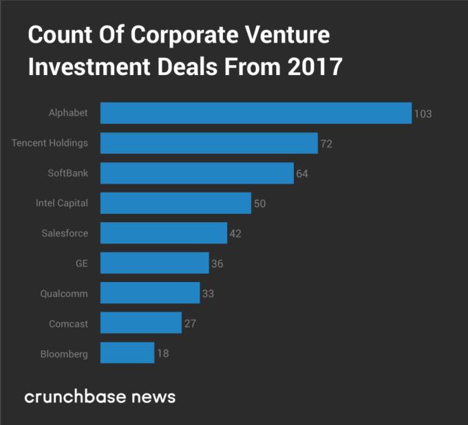 过去很多年里,英特尔及其基金 Intel Capital 一直在企业投资者里高居榜首。但在2017年,Alphabet 坐上头把交椅并远超英特尔一倍之多,除此之外,腾讯控股以及软银跟在 Alphabet之后,位列二三名,其中软银于去年成功募集1000亿美元的主权基金,去年共出手64次。