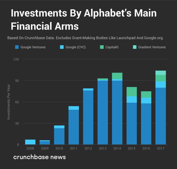 Alphabet 旗下有3支基金,分别为 Google Ventures、CapitalG 以及 Gradient Ventures,除此之外谷歌自己也会少量参与投资。根据 Crunchbase 数据显示,2017年 Alphabet 系共出手103次。