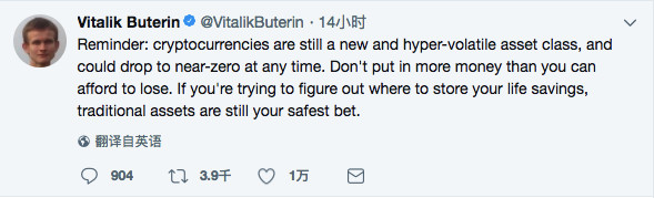 2月17日,以太坊网络(Ethereum)创始人Vitalik Buterin(V神)在推特上再次警告数字货币投资风险,称“传统资产仍是最安全的下注”,并建议不要投入“不在自身承受范围内的钱”。与其他鼓吹区块链数字货币的人不同,V神希望投资者要识别数字货币的风险,不要在搞不清楚状态的时候对超高收益率产生幻想。