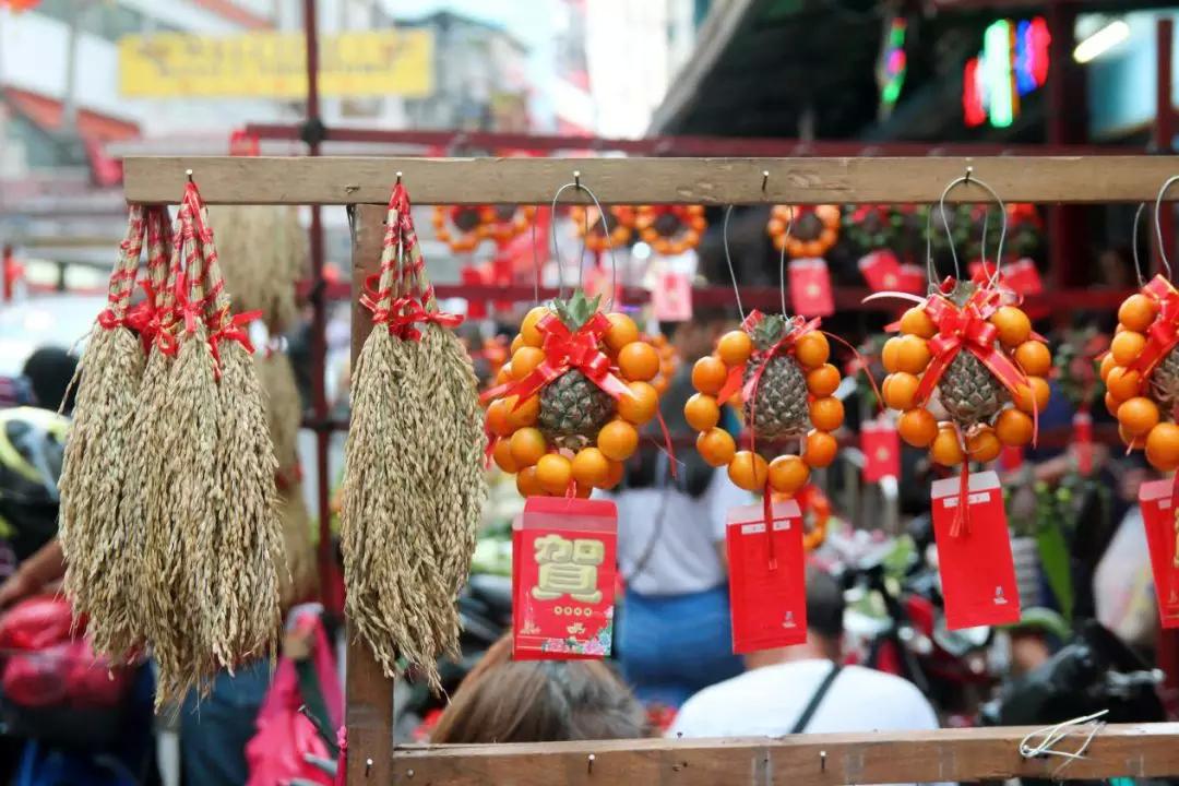 华人商铺最为密集的王彬街,在春节前一周开始张灯结彩,街道两边整齐地挂起了印有“Kung Hei Fat Choi”(粤语‘恭喜发财’)的海报。而商业嗅觉最为敏感的小贩,也摆出了各种口味的年糕,以及颇具当地特色的“凤梨橘”吉祥挂饰。