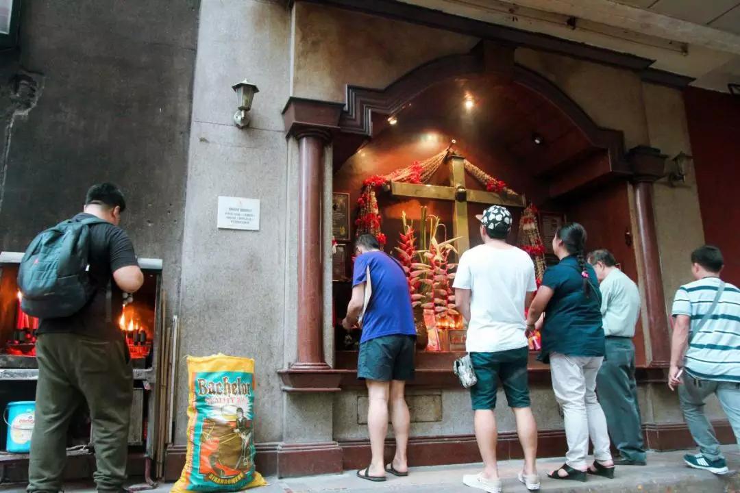 岷伦洛教堂后街,有一面嵌入的墙上摆着一座十字架。当地华人把拜佛的同款仪式移用到这里,一边点烛上香,一边祈求上帝,不免有种喜剧效果。