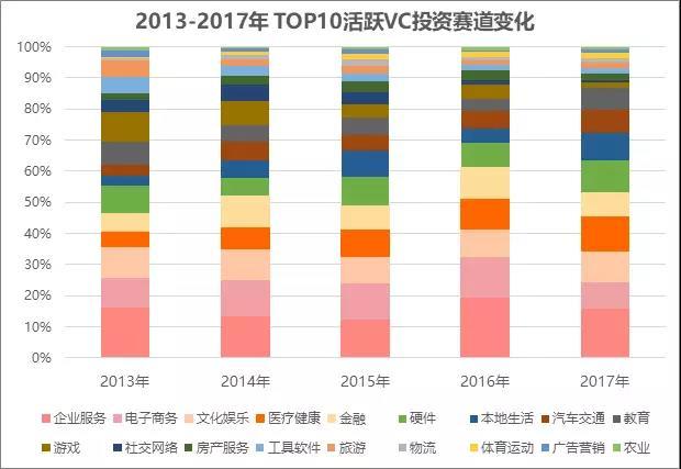 从「2013-2017年 TOP10 活跃 VC 投资赛道的变化」趋势来看,企业服务依然是头部活跃机构重点布局的赛道。随着人口老龄化的加速到来以及企业对于精细化运营管理的需求越来越迫切,能够提高企业运营效率、降低成本的企业服务类项目会获得更大的关注;