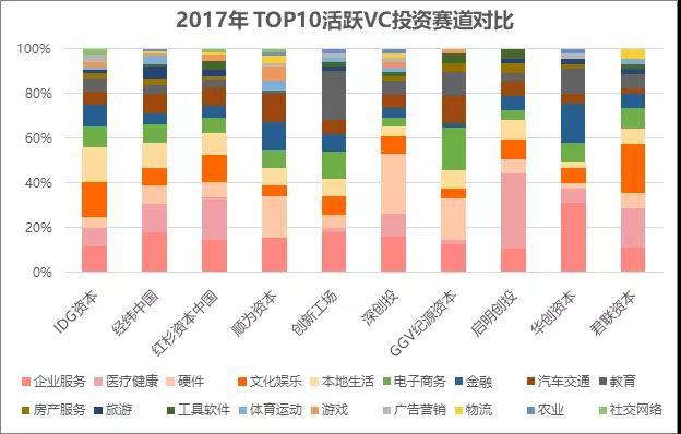 此外,像 IDG 资本在 2017 年的投资重点放在了文化娱乐和以「新零售」和「消费升级」为主的本地生活领域;创新工场的投资重点放在了教育和企业服务领域;GGV 的投资重点放在了硬件和电子商务领域;君联资本的投资重点放在了文化娱乐和医疗健康领域。