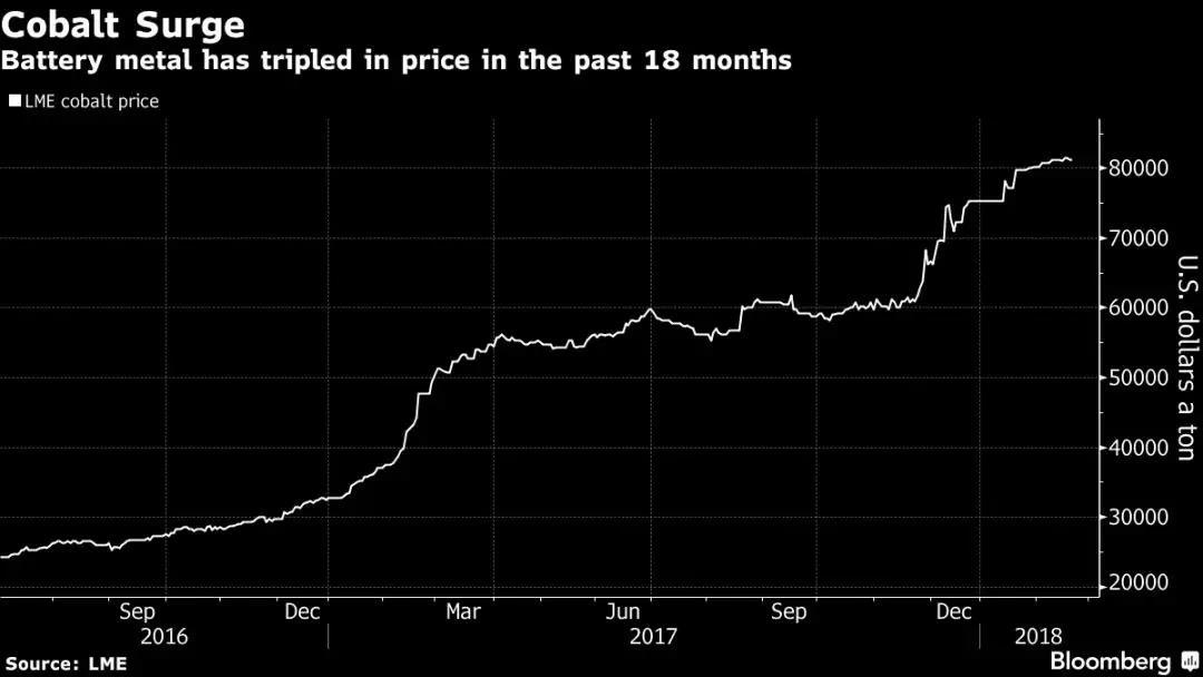 据伦敦贵金属交易所(LME)统计,过去18个月期间,钴矿交易价格上涨约3倍,从2.5万美元/吨的水平涨到8万美元/吨以上。